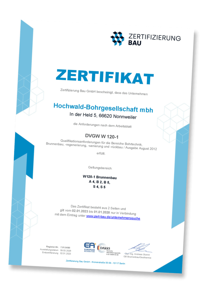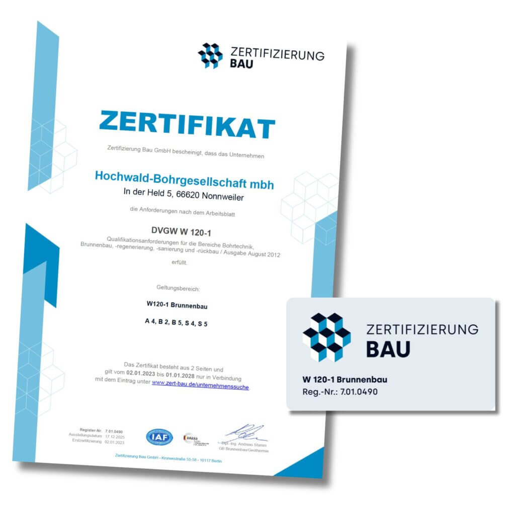 Zertifizierung Bau GmbH bescheinigt, dass das Unternehmen Hochwald-Bohrgesellschaft mbh die Anforderungen nach dem Arbeitsblatt DVGW W 120-1 Qualitätsanforderungen für die Bereiche Bohrtechnik, Brunnenbau, -regenerierung, -sanierung und -rückbau / Ausgabe August 2012 erfüllt.
